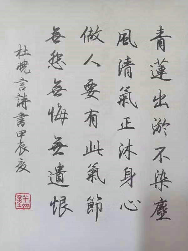 青蓮出淤不染塵2024-06-27仿宋青蓮出淤不染塵杜曉言詩孫生(全國硬筆書法大賽一等獎獲得者)青蓮出淤不染塵,風(fēng)清氣正沐身心。做人若有此氣節(jié),無怨無悔無遺恨。重慶...