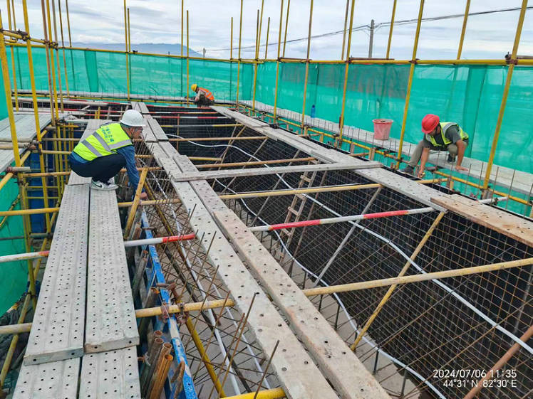 臺身前墻及側(cè)墻第一層模板報驗2024-07-09圖為新疆兵團建工水電集團市政路橋公司第五師雙河市沙山子線公路互通立交工程大橋左幅號橋臺臺身前墻及側(cè)墻第一層模板報驗。王小丫攝...