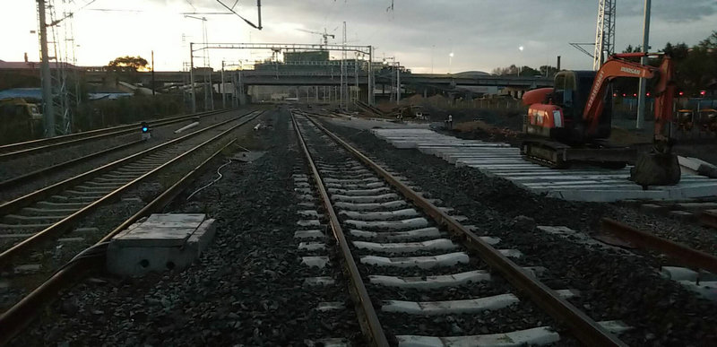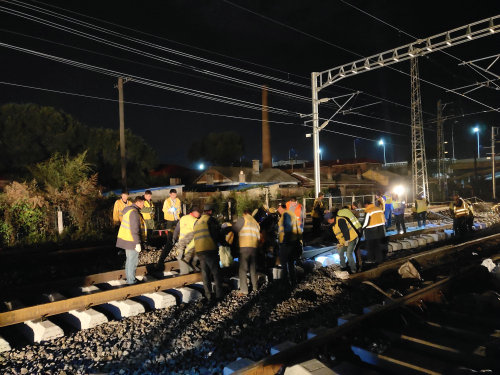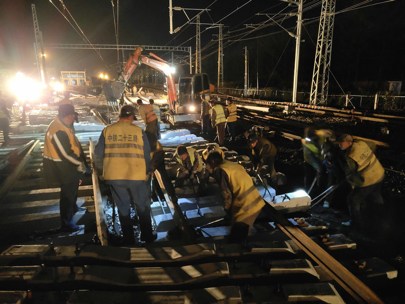 新建動(dòng)車存車場(chǎng)是客整所工程的重要組成部分,針對(duì)當(dāng)天的封鎖計(jì)劃,項(xiàng)目部召開(kāi)專題會(huì)議,制定了詳細(xì)的作戰(zhàn)方案,配備了近百名施工人員,兩臺(tái)挖掘機(jī)、裝載機(jī)和一臺(tái)叉車,大到整體規(guī)劃,小到人員站位,超前預(yù)想,完善措施。二工區(qū)經(jīng)理吳佰峰提前半小時(shí)就組織施工人員到達(dá)現(xiàn)場(chǎng),22:00整,封鎖命令下達(dá)后,現(xiàn)場(chǎng)作業(yè)哨聲響起,工人們迅速上道,開(kāi)始了緊張的操作。由于項(xiàng)目經(jīng)理袁正國(guó)、常務(wù)副經(jīng)理郭慶富、安全總監(jiān)費(fèi)亞臣始終在現(xiàn)場(chǎng)協(xié)調(diào)指揮,鼓舞了士氣,封鎖施工過(guò)程進(jìn)展順利。自動(dòng)車存車場(chǎng)開(kāi)工以來(lái),項(xiàng)目部采取分階段倒場(chǎng)過(guò)渡方案施工,圍繞現(xiàn)場(chǎng)環(huán)境組織精干力量,用方案指導(dǎo)現(xiàn)場(chǎng),班子成員包保監(jiān)控,力保新鋪和預(yù)鋪的各線順利推進(jìn),也為此次封鎖順利開(kāi)通奠定了基礎(chǔ),更為按時(shí)兌現(xiàn)客整所節(jié)點(diǎn)提供了保障。