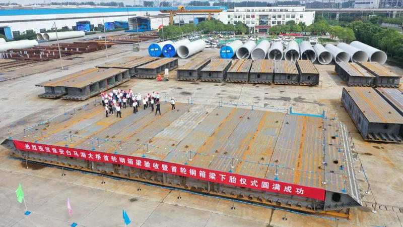 7月3日,隨著現(xiàn)場(chǎng)指揮人員一聲令下,中建安裝集團(tuán)五洲公司(以下簡(jiǎn)稱:中建五洲)鋼結(jié)構(gòu)成品車間內(nèi),裝載著重67.6噸、長18米、寬4.1米、高2.5米首輪首節(jié)鋼箱梁的平板車平穩(wěn)駛出總拼車間進(jìn)入涂裝工序,提前50天順利 下胎,標(biāo)志著中建五洲承接的淮安白馬湖大橋建造項(xiàng)目迎來了開門紅。