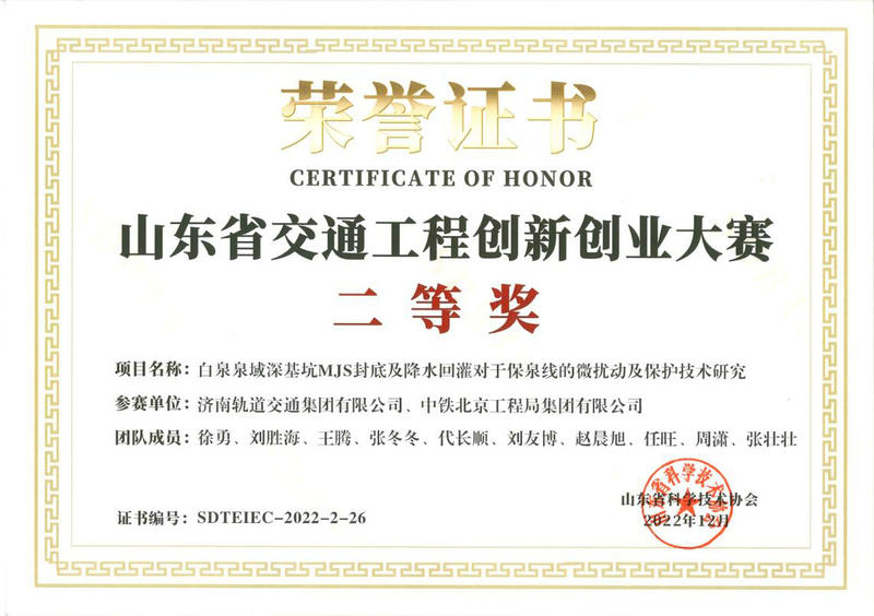 近日,由城軌公司承擔(dān)完成的項目“白泉泉域深基坑MJS封底及降水回灌對保泉線的微擾動及保護(hù)技術(shù)研究”成果喜獲山東省科技技術(shù)協(xié)會舉辦的2022年山東省交通工程創(chuàng)新創(chuàng)業(yè)大賽二等獎。