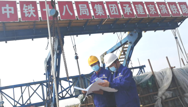 6、4月17日,中鐵十八局集團(tuán)京濱高鐵二標(biāo)一分部項(xiàng)目總工張守陸、施工隊(duì)負(fù)責(zé)人吳孝力在研究施工方案(楊士超 攝)