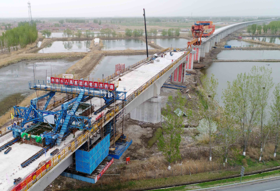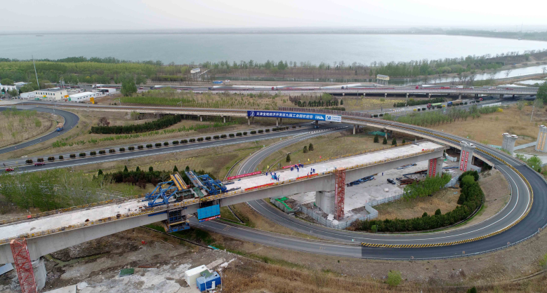 1、4月17日,中鐵十八局集團(tuán)承建的京濱高鐵北辰特大橋津薊高速九園匝道連續(xù)梁合龍(楊士超 攝)