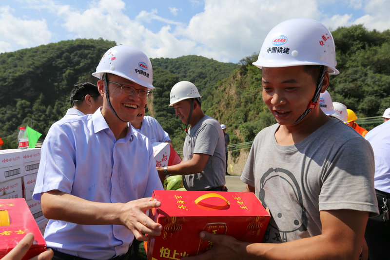 中鐵二十一局三公司副總經(jīng)理、總會計師郝敬豪(左)向施工人員發(fā)放慰問品。