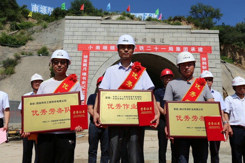 根據(jù)慶典議程安排,首先由8標項目部副經(jīng)理王志貴致辭,然后由常務副經(jīng)理、總工李福成介紹小南塬隧道施工情況。蒙西華中鐵路蒙陜指揮部副總工程師王俊勝宣讀賀電、中鐵二院監(jiān)理公司蒙華鐵路項目部總監(jiān)羅建偉致辭。接下來,8標項目部質量總監(jiān)王武高宣讀了《關于對小南塬隧道貫通進行獎勵的決定》、副經(jīng)理呂劍宣讀了《關于表彰小南塬隧道施工“優(yōu)秀作業(yè)隊”、“優(yōu)秀勞務隊”的決定》,承建小南塬隧道的蒙華二工區(qū)獲獎30萬元。中鐵二十一局集團公司副總經(jīng)理、項目經(jīng)理馮建軍在講話中,對小南塬隧道順利貫通表示熱烈祝賀,對在施工中作出突出貢獻的二工區(qū)員工表示誠摯的感謝,希望參建員工繼續(xù)努力,為奪取蒙華鐵路施工的最后勝利再立新功。