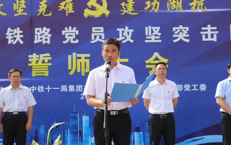 活動(dòng)上,中鐵十一局集團(tuán)有限公司湖杭鐵路項(xiàng)目經(jīng)理羅建軍提出,舉行“攻堅(jiān)克難,建功湖杭”黨員攻堅(jiān)突擊隊(duì)誓師大會(huì),目的只有一個(gè),就是以此為起點(diǎn),向著我們湖杭項(xiàng)目的五項(xiàng)重點(diǎn)卡控工程發(fā)起攻堅(jiān)沖鋒,現(xiàn)在已經(jīng)到了決戰(zhàn)決勝的關(guān)鍵時(shí)刻。他強(qiáng)調(diào),要認(rèn)清形勢(shì),再鼓干勁,迅速掀起攻堅(jiān)突擊高潮。項(xiàng)目部要積極配合各黨員攻堅(jiān)突擊隊(duì),超前做好施工準(zhǔn)備工作,有效投入精力,優(yōu)化施工方案,合理調(diào)配人員、設(shè)備和物資材料,保障五項(xiàng)重點(diǎn)卡控工程現(xiàn)場(chǎng)的有序施工。今年是習(xí)總書(shū)記提出“兩山”理論的十五周年,項(xiàng)目各級(jí),特別是擔(dān)負(fù)具體任務(wù)的各黨員攻堅(jiān)突擊隊(duì),一定要正確處理好生態(tài)環(huán)境與工期效益的關(guān)系,力求在不損害生態(tài)環(huán)境的前提下合理推進(jìn)施工進(jìn)度,確保“兩手抓、兩手贏”。