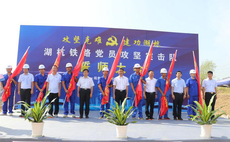 誓師大會(huì)上,參加領(lǐng)導(dǎo)為湖杭鐵路三標(biāo)項(xiàng)目5支重難點(diǎn)卡控工程黨員攻堅(jiān)突擊隊(duì)和2支青年突擊隊(duì)授旗,突擊隊(duì)隊(duì)長(zhǎng)代表向領(lǐng)導(dǎo)遞交《重難點(diǎn)工程攻堅(jiān)承諾書(shū)》。在場(chǎng)的百余名黨員及青年突擊聯(lián)隊(duì)隊(duì)員在施工現(xiàn)場(chǎng)進(jìn)行了莊嚴(yán)的宣誓,將為湖杭鐵路建設(shè)奉獻(xiàn)熱情、汗水、青春。
