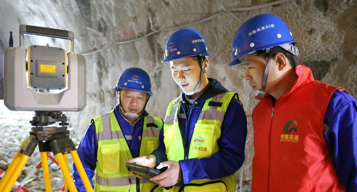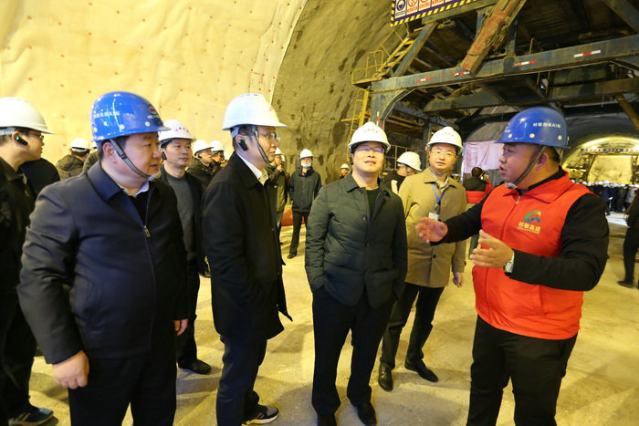 項目負(fù)責(zé)人李蕓(左一)為交通廳副廳長劉震華(中)等領(lǐng)導(dǎo)匯報隧道施工情況