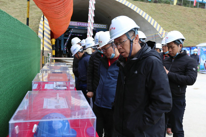 上午11時,江西省交通廳副廳長劉震華、江西省高速公路投資有限公司副總經(jīng)理俞文生、祁婺高速公路項目辦主任習(xí)明星、副主任戴程琳等領(lǐng)導(dǎo),帶領(lǐng)觀摩人員來到月嶺隧道進(jìn)口,聽取了中鐵二十一局三公司副總經(jīng)理張小衛(wèi)、項目負(fù)責(zé)人李蕓、項目總工程師陳志泉就月嶺隧道建設(shè)情況的匯報。左右線全長2401米的月嶺隧道是A1標(biāo)重點工程,在施工中采用先進(jìn)的“九臺套”組合設(shè)備,即:三臂鑿巖臺車、三臂立拱臺車、濕噴機(jī)械手、三維激光掃描儀、防水板鋪設(shè)臺車、二襯澆筑智能化監(jiān)控臺車、超前水平鉆、自動化二襯養(yǎng)護(hù)臺車、液壓電纜溝槽臺車等,實現(xiàn)了隧道施工流水化作業(yè)。并通過“三創(chuàng)新”和規(guī)范化作業(yè),保證了隧道施工的安全質(zhì)量和規(guī)范化、標(biāo)準(zhǔn)化,為打造業(yè)主提出的“品質(zhì)工程、品質(zhì)祁婺”創(chuàng)造了有利條件。