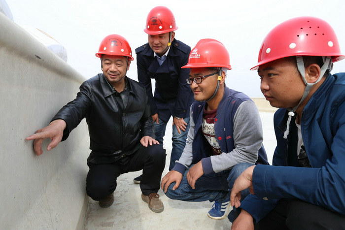 項(xiàng)目書記于喜田(左一)、副經(jīng)理?xiàng)钴姡ㄗ蠖⒐こ滩块L楊林(右一)、一工區(qū)經(jīng)理王彥彥(右二)在檢查防撞墻質(zhì)量。