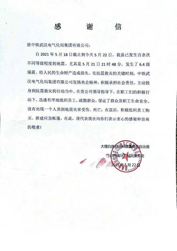 5月18日至23日,云南省大理州漾濞縣經歷了數(shù)百次不同程度的地震,其中5月21日21時48分發(fā)生6.4級地震,震源深度8公里,漾濞縣多地震感強烈。目前大理州已啟動二級應急響應,應急救援隊伍已經趕赴災區(qū),駐滇央企中鐵武漢電氣化局集團有限公司大瑞項目部迅速行動,積極配合當?shù)卣爱數(shù)卮迕襁M行抗震減災行動。