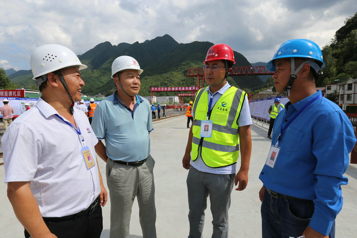 圖為參加現(xiàn)場(chǎng)觀摩的公司副總經(jīng)理雷榮仁(左二)、項(xiàng)目經(jīng)理王亞輝(左一)與管理處安質(zhì)科科長(zhǎng)李善群(右二)、總監(jiān)辦總監(jiān)馮五一(右一)在制梁場(chǎng)交談