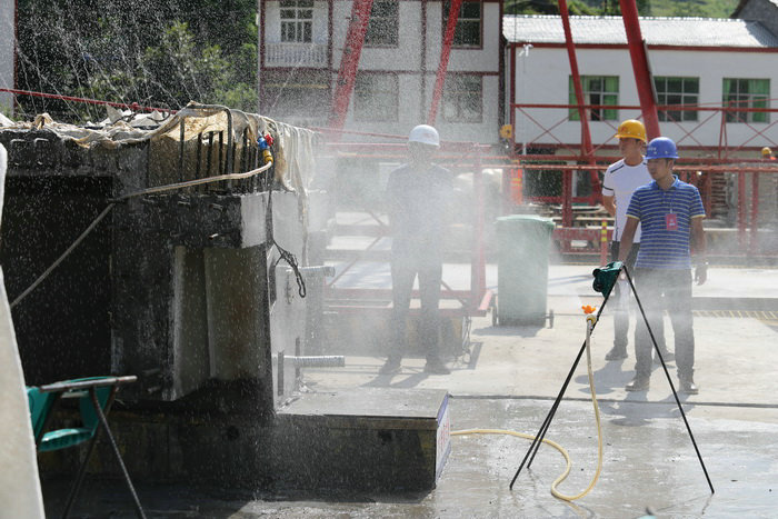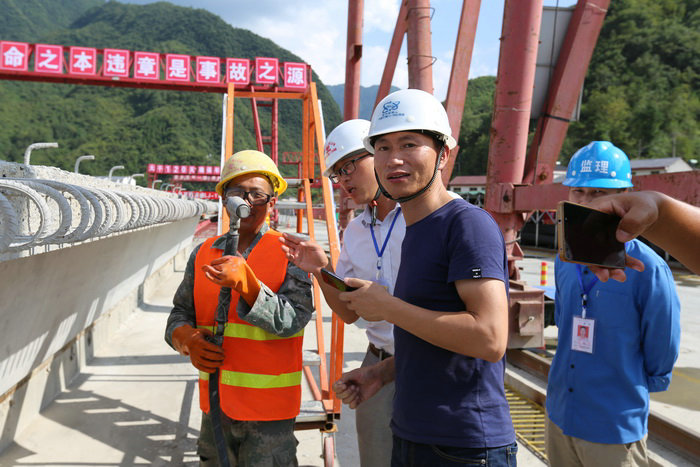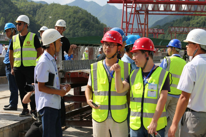 在參觀制梁施工中,盡管氣溫很高,曬得人汗流浹背,但觀摩人員卻忘情投入,看的十分仔細(xì)。干凈整潔,規(guī)模宏大的現(xiàn)代化制梁場(chǎng)令人耳目一新。在鋼筋綁扎機(jī)現(xiàn)場(chǎng),很多觀摩人員親自體驗(yàn)。在噴淋養(yǎng)生系統(tǒng)、梁場(chǎng)鋼筋安裝移動(dòng)推拉式遮雨棚、梁板濕接縫、端頭橫梁接頭手持式混凝土鑿毛機(jī)操作現(xiàn)場(chǎng),觀摩人員不停詢(xún)問(wèn),副經(jīng)理暴林一一作答。很多人拿出手機(jī)拍照錄相,記錄制梁施工過(guò)程。當(dāng)記者問(wèn)18標(biāo)江西路橋常務(wù)副經(jīng)理張小剛的觀摩感受,他說(shuō):“17標(biāo)制梁場(chǎng)規(guī)模宏大,工藝先進(jìn)、設(shè)備先進(jìn),這才是真正的標(biāo)準(zhǔn)化施工,看了令人震撼。中鐵二十一局三公司是央企,我們沒(méi)法比啊。”旁邊一位帥氣的監(jiān)理接過(guò)話(huà)說(shuō):“那你們要加油??!”