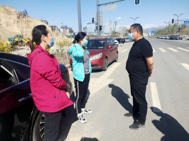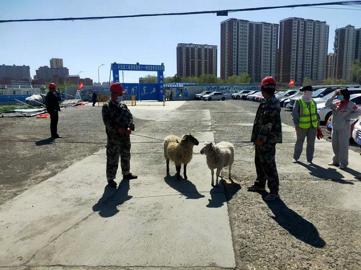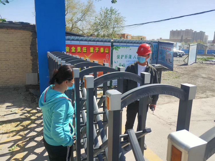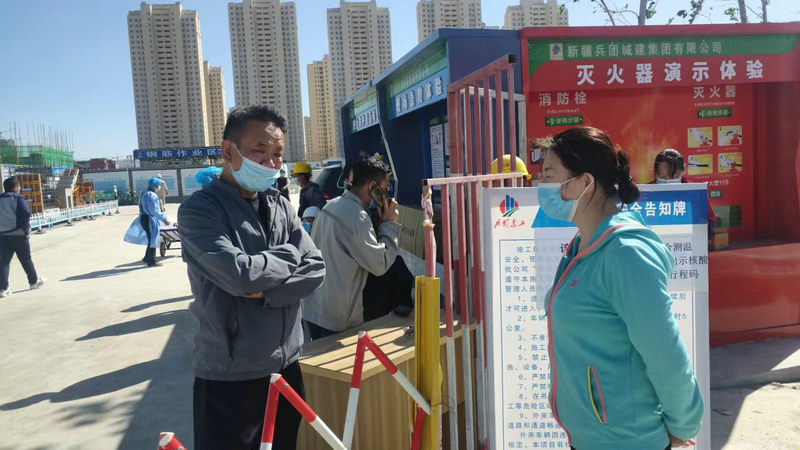 下圖為:兵團(tuán)五建黨委副書記、工會(huì)主席李彩英與黨群部副部長王超華慰問“東方茂項(xiàng)目”現(xiàn)場(chǎng)施工人員。因當(dāng)前屬于特殊時(shí)期,為確保人員健康、工程順利施工,該項(xiàng)目進(jìn)行封閉式管理,禁止人員隨意出入,只能隔著大門表達(dá)問候。