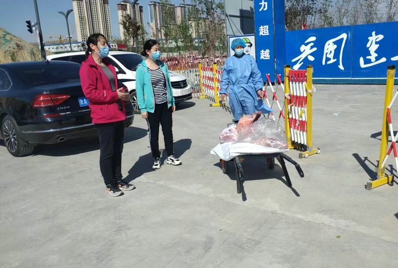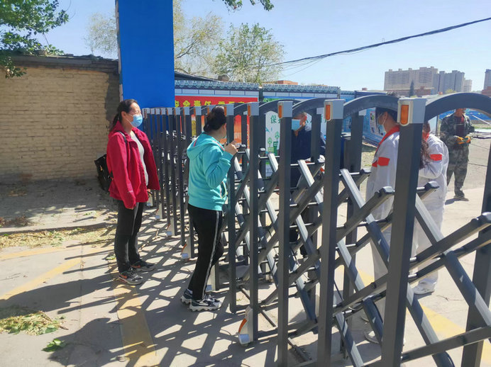 下圖為:兵團(tuán)五建黨委副書記、工會(huì)主席李彩英與黨群部副部長王超華慰問“兵團(tuán)建工城建集團(tuán)十一師黨委黨校、民兵綜合訓(xùn)練基地建設(shè)項(xiàng)目”現(xiàn)場(chǎng)施工人員。因當(dāng)前屬于特殊時(shí)期,為確保人員健康、工程順利施工,該項(xiàng)目進(jìn)行封閉式管理,禁止人員隨意出入,只能隔著大門表達(dá)問候。