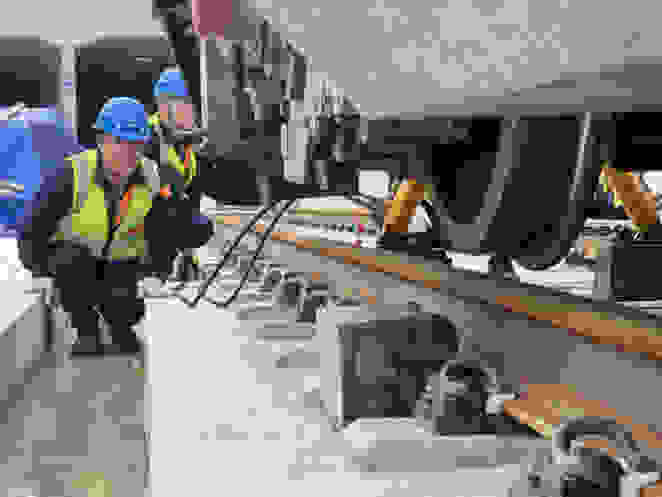 整個(gè)現(xiàn)場(chǎng)起復(fù)救援演練有條不紊的進(jìn)行著,應(yīng)急小組到達(dá)現(xiàn)場(chǎng)后第一時(shí)間在現(xiàn)場(chǎng)做好防護(hù),將不起復(fù)一端的車輪用止輪器牢靠固定,起復(fù)一端的車輪減震簧中部的螺桿擰上墊圈和螺母,使車輪和車體牢靠固定,隨后在軌道車車鉤處安裝“弓”型頂托,接著將油缸、“鞍”型頂托和鏈條組裝成穩(wěn)定的三角形,操作油泵使油缸伸出并使車鉤向上頂實(shí),此時(shí)開始進(jìn)行整個(gè)流程里最關(guān)鍵的一環(huán),操作復(fù)軌器使其頂起車輛前端向上移動(dòng)并橫移至適當(dāng)?shù)乃礁叨?,緩慢降低,使輪?duì)與鋼軌踏面完美咬合,最后有序的撤除現(xiàn)場(chǎng)應(yīng)急設(shè)備,指揮組宣布演練結(jié)束。