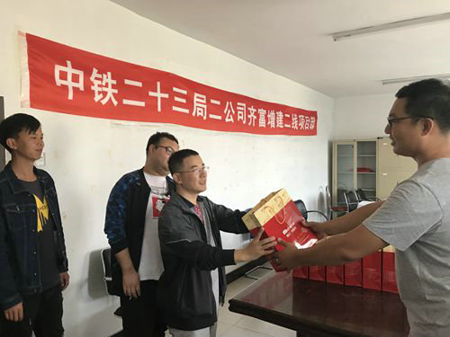 金秋送爽,丹桂飄香,在中秋佳節(jié)來(lái)臨之際,中鐵二十三局二公司齊富增建二線項(xiàng)目部工委會(huì)聯(lián)合中鐵二十三局二公司工會(huì)在K1+289.7公里鐵路道口人行天橋施工現(xiàn)場(chǎng)和項(xiàng)目部駐地辦公區(qū)開(kāi)展迎雙節(jié)慰問(wèn)活動(dòng),提前為項(xiàng)目部全體職工送上中秋的祝福。