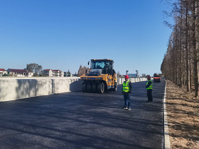 項(xiàng)目負(fù)責(zé)人虞久榮表示,作為全線第一個(gè)瀝青施工點(diǎn),本次瀝青混凝土路面的開(kāi)工為11月底全線堤頂?shù)缆坊就旯さ於藞?jiān)實(shí)基礎(chǔ)。