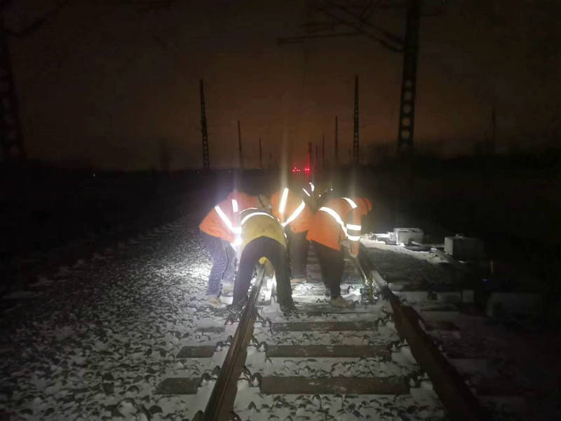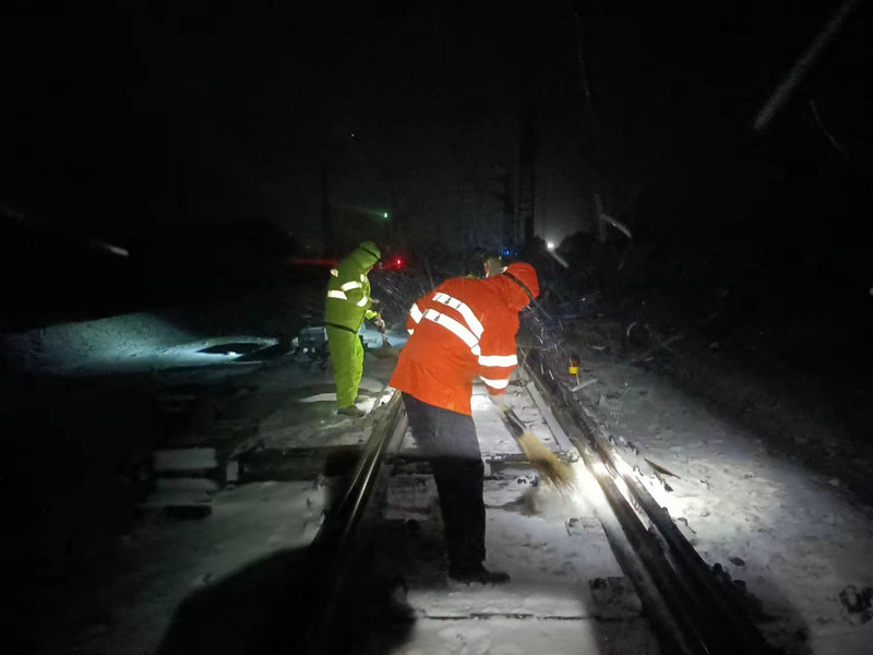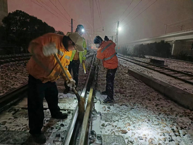 1月14日,皖西北地區(qū)迎來(lái)降溫、降雪過(guò)程,中國(guó)鐵路上海局集團(tuán)有限公司阜陽(yáng)工務(wù)段亳州線路車間為確保京九線列車運(yùn)行安全暢通,自14日晚上到15日早上組織人員對(duì)各站場(chǎng)道岔進(jìn)行掃雪、除凍。