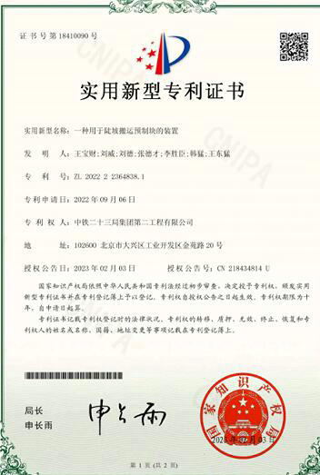 除此之外,由該項(xiàng)目原經(jīng)理,現(xiàn)任中鐵二十三局集團(tuán)二公司黨委書(shū)記、執(zhí)行董事劉德與現(xiàn)任項(xiàng)目經(jīng)理王寶財(cái)、總工程師王大勇等研制的用于陡坡搬運(yùn)混凝土預(yù)制塊裝置以及用于提高鋼筋籠箍筋施工效率裝置的兩項(xiàng)工法也先后獲得國(guó)家專利。