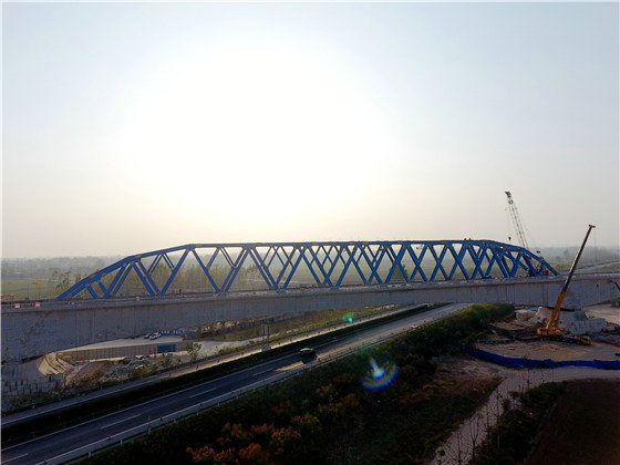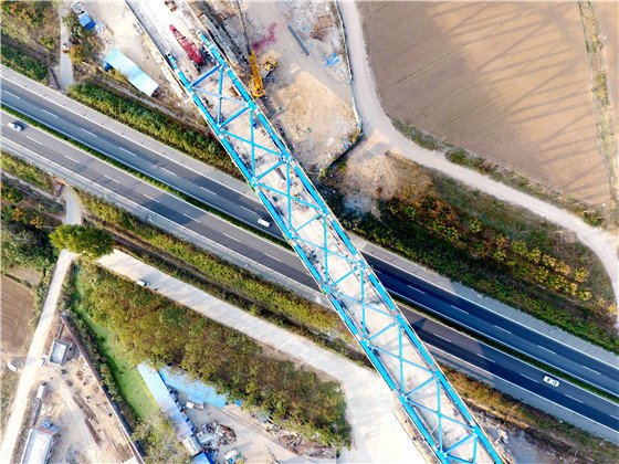 當天,在鄭阜鐵路跨寧洛高速連續(xù)梁鋼桁梁拼裝施工現(xiàn)場,遠遠就能看見一排高聳田間的高架橋,早已成為沃野間一道壯麗風(fēng)景線。眺望大橋,宛如一條藍色巨龍,橫貫G36寧洛高速,為豫東門戶再添新的靚麗風(fēng)景,橋下依然滿是川流不息的來往車輛,看似“親密”但又互不影響。
