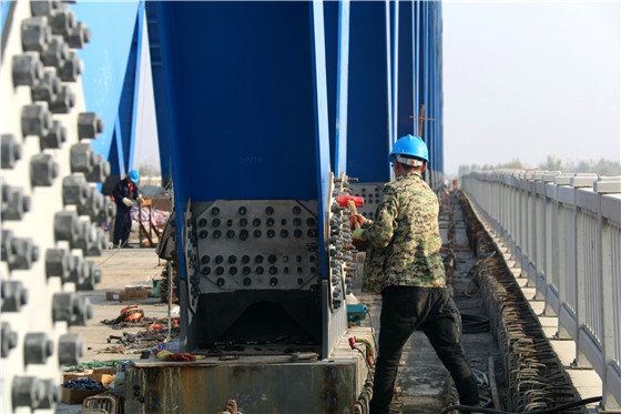 “為確保該連續(xù)梁橋各節(jié)點目標順利實現(xiàn),中鐵一局鄭阜鐵路項目部不斷優(yōu)化施工方案,開展多項科技攻關(guān),多次組織相關(guān)專家進行技術(shù)方案研討論證,有效針對超高大節(jié)段0號塊施工、鋼桁節(jié)點板精準預(yù)埋、超大跨度連續(xù)梁線性控制、鋼桁梁制作及拼裝等諸多困難,制定切實、可靠、安全高效的施工方案,并嚴格執(zhí)行。后經(jīng)相關(guān)監(jiān)控單位測量,項目拼裝完成后的曲弦鋼桁梁桁高、節(jié)點長度偏差均在1.5毫米,主桁中心距對角線偏差2毫米,全橋鋼桁拼裝精度高,各項檢測指標均符合設(shè)計要求,實現(xiàn)由“紙上藍圖”變“地上通途”。”項目總工程師張洪偉介紹道。