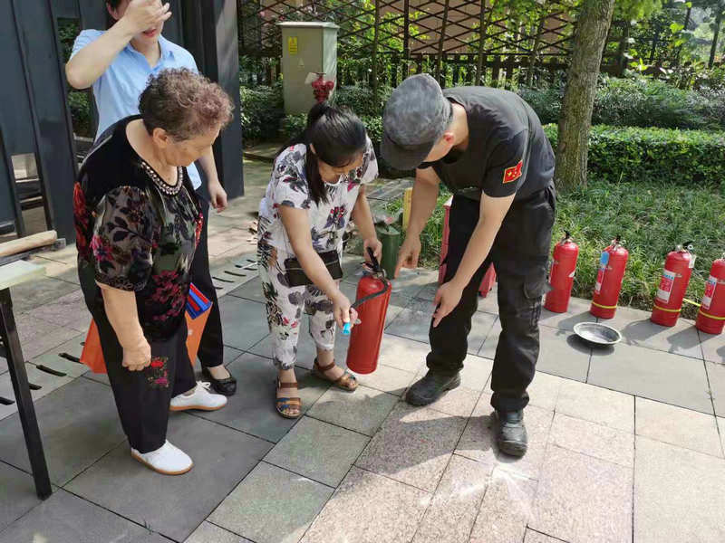 在現(xiàn)場有一群身著工裝,手握橫幅及宣傳冊人員穿插在小區(qū)業(yè)主人群中,為小區(qū)居講解著消防安全應(yīng)急知識,還手把手教居民怎樣正確的使用滅火器、消防栓等。