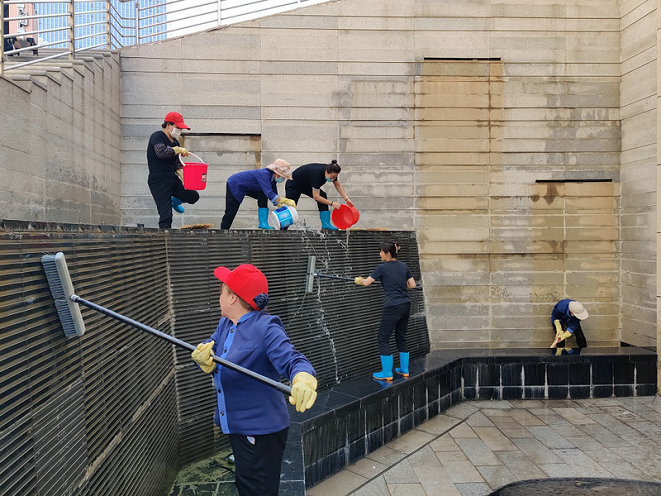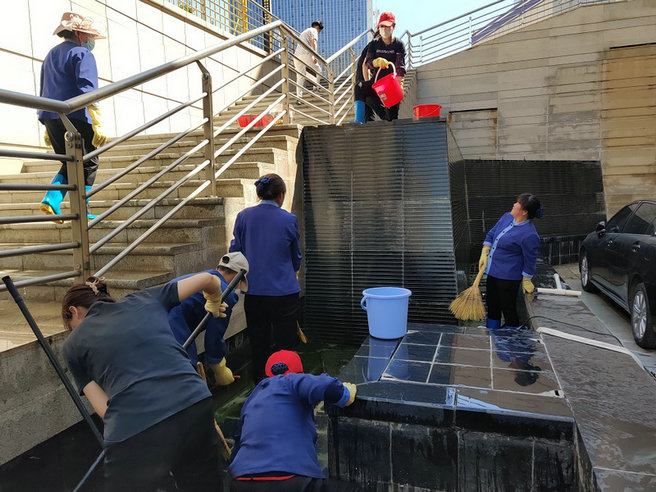 為不影響到大廈的美觀、整潔和舒適感。大家不畏艱辛,不厭其煩的一點(diǎn)一點(diǎn)在烈日下大清洗。經(jīng)多人合作,長(zhǎng)達(dá)幾個(gè)小時(shí)的高溫天氣下清掏沖洗,水池也漸漸變得煥然一新。噴泉也逐漸回復(fù)了往日的正常運(yùn)轉(zhuǎn)。