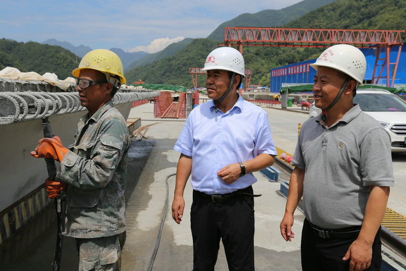 經(jīng)理王亞輝(右)陪同公司黨委副書記、紀(jì)委書記郝禮(中)檢查箱梁濕接縫鑿毛