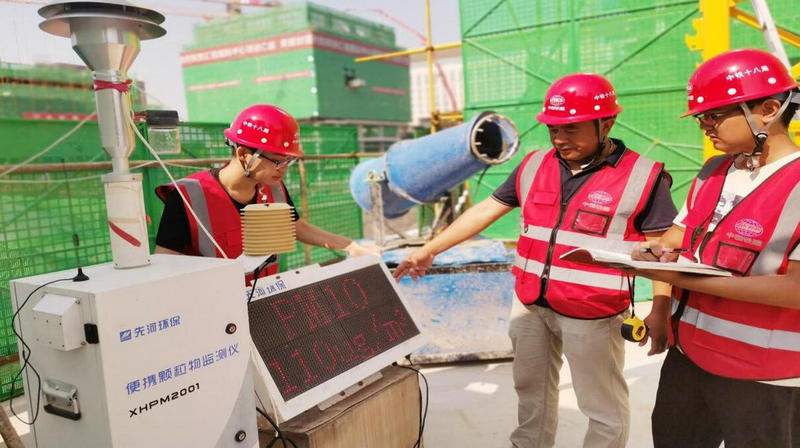 中鐵十八局集團北京公司河北項目群建設(shè)者在正定匯程國際中心項目通過顆粒物檢測儀實時監(jiān)測空氣質(zhì)量(伍振 攝)