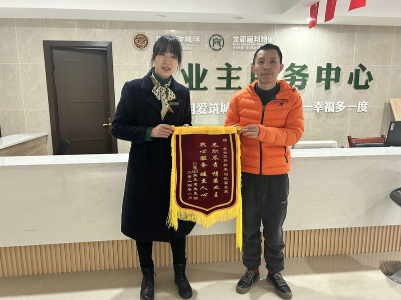 重慶合川訊(通訊員 秦偉建)。2024年2月18日,重慶北新宜邦物業(yè)樓棟管家劉德霜收到了10棟6-3業(yè)主特意定制的一面繡著“盡職盡責(zé),情系業(yè)主”的錦旗,表示著對(duì)樓棟管家劉德霜任勞任怨工作的認(rèn)可和深深的感謝。
