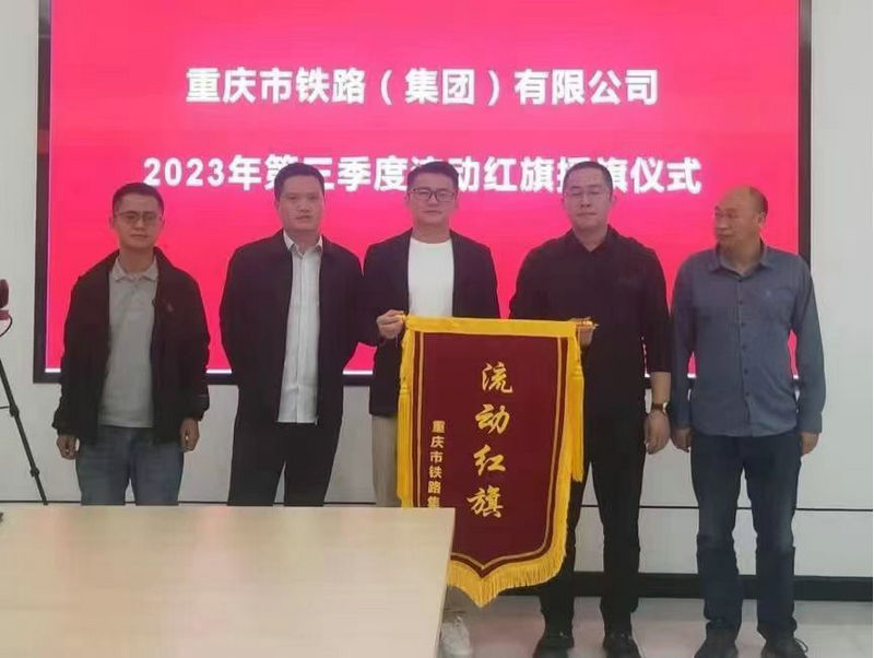 2023年項目經(jīng)理阮超(右2)接受重慶市鐵路集團授予項目部“文明施工流動紅旗”,迄今年為止保持兩年冠