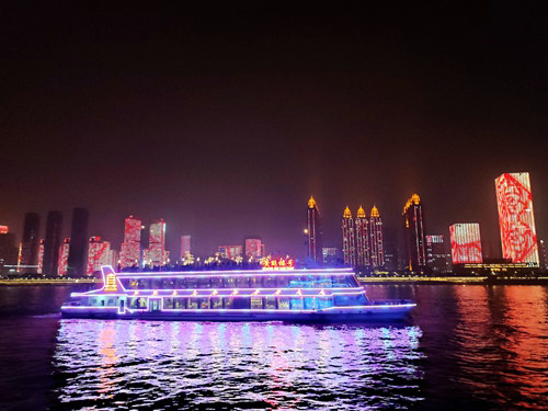 晚餐后,戰(zhàn)友們興致勃勃的來(lái)到了長(zhǎng)江2號(hào)碼頭,乘船游覽了兩江。武漢兩江夜游從武昌紅巷碼頭出發(fā),途經(jīng)黃鶴樓、長(zhǎng)江大橋、武昌造船廠、世貿(mào)錦繡長(zhǎng)江、龜山電視塔、晴川閣、晴川橋、中國(guó)角(南岸嘴)、龍王廟、武漢關(guān)鐘樓、106西安艦、303潛水艇、武漢客運(yùn)港、漢口江灘、粵漢碼頭、武昌江灘、武昌紅巷碼頭,有“工行牡丹”號(hào)、“東湖”號(hào)、“古琴臺(tái)”號(hào)、“江城”號(hào)等不同船只,隨機(jī)安排,每班航行1小時(shí)。