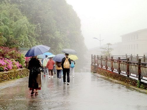 但面對老天爺?shù)牟焕斫?,我們也很無奈。導游與我們商量,再等等看,看能否云開霧散?雨還在下,不見變小,但云霧卻越來越濃,剛才還能看到的觀音臺、鶴壽頂?shù)染包c,在大雨的督促下,稍瞬即逝,等了大約半個小時也不見好轉(zhuǎn)。手機上看了看當日的天氣預(yù)報,也不見好轉(zhuǎn)的跡象。
