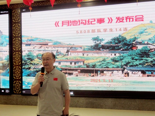 舞臺上方是以學(xué)生14連當(dāng)年的連隊(duì)駐地月池溝為背景設(shè)計(jì)的畫面,“《月池溝紀(jì)事》發(fā)布會”異常醒目。