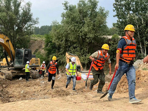 當(dāng)天,演練模擬巡河員發(fā)現(xiàn)上游因強(qiáng)降雨導(dǎo)致水位上漲且水質(zhì)渾濁,汛情預(yù)計(jì)30分鐘后到達(dá)施工區(qū)域情景,接到報(bào)告后,應(yīng)急領(lǐng)導(dǎo)小組組長立即啟動(dòng)應(yīng)急預(yù)案,在組長的安排指揮下,搶險(xiǎn)組加固土坡、裝沙袋、運(yùn)沙袋,同時(shí)組織挖機(jī)修復(fù)便道,恢復(fù)交通;疏散警戒組檢查河道內(nèi)有無施工人員,機(jī)械設(shè)備及村民,有無阻礙泄洪的障礙物,對(duì)周邊實(shí)行警戒,組織指揮交通,確保救援道路暢通和人員安全撤離。