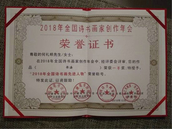 2018年12月25日至28日,由中國硬筆書法協(xié)會對外交流委員會、中國硬筆書法協(xié)會老年峰會、中國詩書畫家網(wǎng)、羲之書畫報聯(lián)合舉辦的2018年全國詩書畫家創(chuàng)作年會頒獎盛典在海南三亞舉行。何禮明書法作品榮獲2018年全國詩書畫家創(chuàng)作年會一等獎。