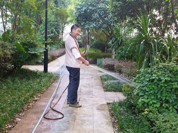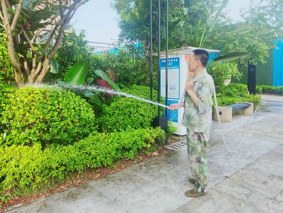 高溫仍在持續(xù),抗旱還需進(jìn)行,烈日下,綠化養(yǎng)護(hù)員工黝黑的皮膚與小區(qū)的綠意盎然形成鮮明的對(duì)比,他們用自己的汗水,換來(lái)小區(qū)綠樹(shù)成蔭、賞心悅目。
