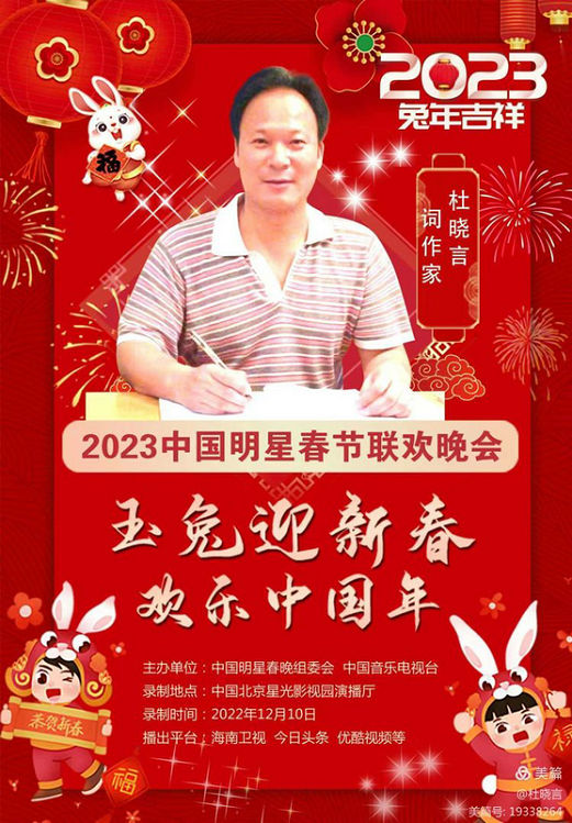 杜曉言,軍旅詞作家,騰訊音樂人,中國音樂著作權(quán)協(xié)會會員,中國職工攝影家協(xié)會會員,《鐵路工程建設網(wǎng)》通訊員,《大眾原創(chuàng)詩詞網(wǎng)刊》簽約作家,《美篇旅游》顧問等。1962年11月山東鄆城生人。1981年10月參加鐵道兵,1984年1月隨鐵道兵集體兵轉(zhuǎn)工。迄今在《中央電視臺》《內(nèi)蒙古衛(wèi)視》《海南衛(wèi)視》《山西衛(wèi)視》《安徽衛(wèi)視》《河南衛(wèi)視》《中國國際廣播網(wǎng)》《廣西廣播網(wǎng)》《QQ音樂》等演唱作詞歌曲100多首。在《詞刊》《歌曲》《廣播歌選》《解放軍歌曲》《重慶音樂》《上海歌聲》等發(fā)表歌詞500多首,創(chuàng)作歌詞3000多首。作詞歌曲代表作《再唱美麗的草原我的家》《天路新歌》《我的中國》《祖國,我為你自豪》《生生死死都愛你》《愛上你就不后悔》《夢中的哈達》《《江南水鄉(xiāng)》《水鄉(xiāng)江南》《不老情緣》《紅塵不了情》《謝謝你伸手拉過我》《遠方的阿哥你好嗎》《江南美》《美麗的牽掛》《我的江南》《筑路的哥哥走四方》等,作詞歌曲《西雙版納的歌謠》《壯鄉(xiāng)三月春光美》等多首作詞歌曲改編葫蘆絲名曲廣為流傳,《我的中國》《祖國,我為你自豪》《最暖的陽光》等多首作詞歌曲參加大型文藝晚會并獲獎,《水鄉(xiāng)江南》《走壯鄉(xiāng)》等多首作詞歌曲收入大學音樂教材。與張雷雷、于天海等合作電影《落潮灣》主題歌《落潮灣戰(zhàn)事》,電視劇《蜀漢戰(zhàn)神傳》主題歌《英雄無淚》、電影《大漠較量》主題歌《駝鈴駱駝草》等多部影視劇主題歌。著有《情感家園》《選擇美好》等多部歌詞專著。自學成才事跡在《人民日報》《工人日報》《中國新聞網(wǎng).香港》等多家媒體報道!