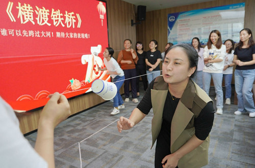 9月30日,在西安建筑分公司機關(guān)會議室,機關(guān)20余名職工共同進行了一場別出心裁的“軍訓(xùn)”。在“軍訓(xùn)”活動中,所有職工分為兩組,必須通過“服從指揮”、“紅歌PK”、“橫渡鐵橋”、“常識問答”等多個環(huán)節(jié)的考驗,才能取得最終的勝利?;顒又?,大家爭先恐后的搶答問題,員工在緊張的工作之余,放松了身心,增進了團隊凝聚力,感受了節(jié)日的快樂和歡愉。