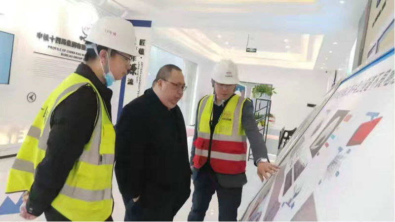 項目部經理阮超(右)總工李文慶(左)向總承包部指揮長李兵(中)匯報中梁山隧道質量和安全受控情況