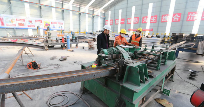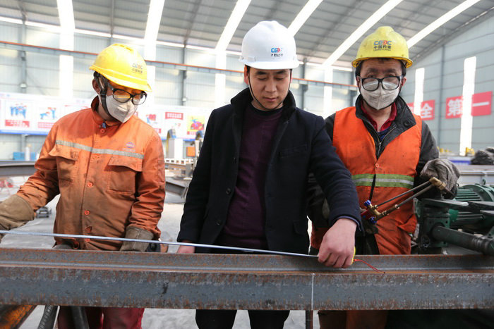 圖為副經(jīng)理段偉峰(中)在鋼構(gòu)廠檢查鋼拱架尺寸