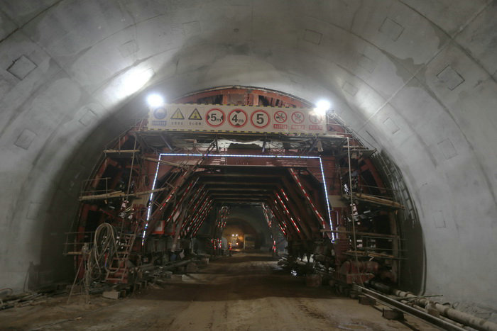 隧道二襯施工從岔口特大橋工地往山上眺望,“楊道塬隧道由中鐵二十一局三公司承建”兩排紅底白字的巨幅廣告牌,在藍(lán)天白云映襯下格外醒目,為深山里的黃土塬增添了一抹亮色。沿著陡峭的盤山便道蜿蜒上行,就是楊道塬隧道出口。洞口正在澆筑仰拱,進(jìn)入洞內(nèi),已二襯的隧道拱頂和邊墻泛著清水混凝土本色,無錯(cuò)臺(tái)和蜂窩麻面,外觀質(zhì)量好。隧道掌子面上,幾名身穿紅黃反光背心的工人在上道坑梯子上,用鐵锨鏟起拱線和拱頂?shù)狞S土。隧道施工隊(duì)負(fù)責(zé)人說:“左洞已掘進(jìn)180米,右洞120米,施工進(jìn)展順利,保證按期貫通沒有問題。”