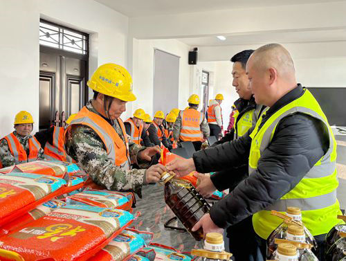 在項目會議室,王慶一行將節(jié)前為勞務(wù)工精心準(zhǔn)備的大米、食用油等生活物資以及節(jié)日慰問品逐一送到了勞務(wù)工及及家屬手中。慰問組與勞務(wù)工朋友們進(jìn)行了親切的交流,深入了解了他們的工作和生活狀況,對勞務(wù)工在社會發(fā)展中所作出的貢獻(xiàn)表示感謝,并向他們致以新春的祝福。