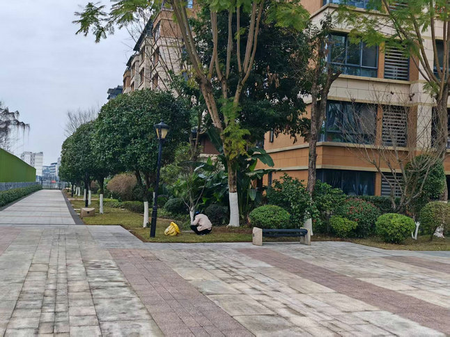 保潔人員集中清理冬季掉落的枯枝落葉,確保小區(qū)環(huán)境干凈整潔。