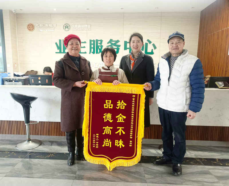 尋回失物后,甘老師激動的表示“錢包里的現(xiàn)金是次要的,但所有證件都在包里,張大姐的拾金不昧的高尚品德讓我特別感動!”2025年2月24日甘老師與家人來到物業(yè)服務(wù)中心親自將一面錦旗送到保潔員張興玲手里。