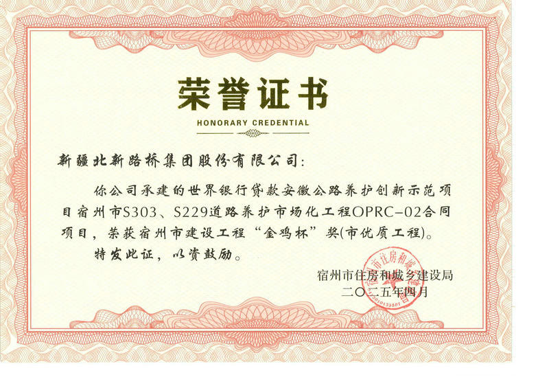 杭州訊(通訊員 張霞)近日,從宿州市住房和城鄉(xiāng)建設局傳來喜訊,由華東分公司承建的宿州市S303、S229道路養(yǎng)護市場化工程OPRC-02合同項目榮獲宿州市建設工程2024年度“金雞杯”獎,這是繼該項目獲得“皖美養(yǎng)護”后的又一榮譽。