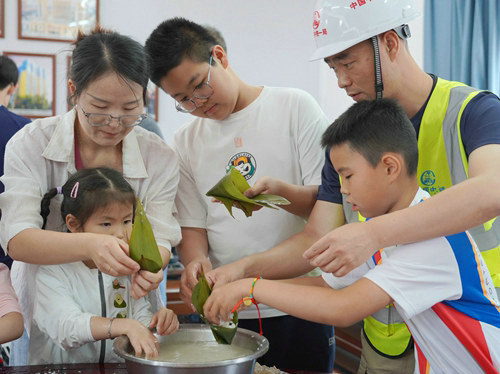 在包粽子環(huán)節(jié)中,項(xiàng)目部為孩子們現(xiàn)場(chǎng)準(zhǔn)備了粽葉、糯米、紅棗、豆沙等多種食材,家長(zhǎng)與孩子默契配合開(kāi)始包粽子,捋粽葉、填餡料、扎棉線,一個(gè)個(gè)飽含愛(ài)意的粽子很快成型。孩子們捧著自己的勞動(dòng)成果,成就感滿(mǎn)滿(mǎn)。