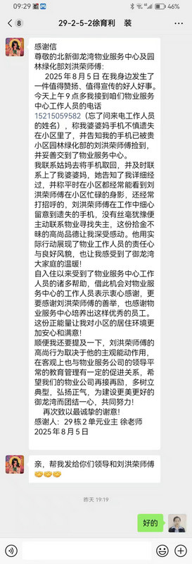 物業(yè)服務(wù)中心項目二部主管接到手機(jī)后,通過手機(jī)內(nèi)的 “敬老卡” 信息,迅速鎖定失主為三街區(qū) 29-2-5-2 的徐育利,并及時聯(lián)系其前來領(lǐng)取。當(dāng)徐育利得知撿到手機(jī)的是平日工作認(rèn)真負(fù)責(zé)、待人熱情的劉洪榮師傅時,難掩激動之情:“劉師傅平時修剪園林就一絲不茍,這次還主動歸還手機(jī),太讓我感動了!” 當(dāng)晚,便寫下感謝信,為劉洪榮的善舉點贊,也向北新宜邦物業(yè)培養(yǎng)出這樣的優(yōu)秀員工致謝。?