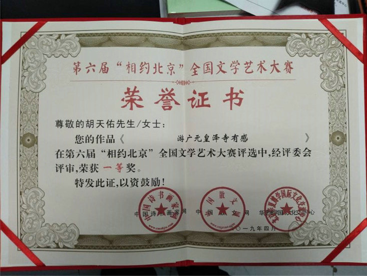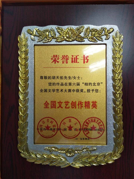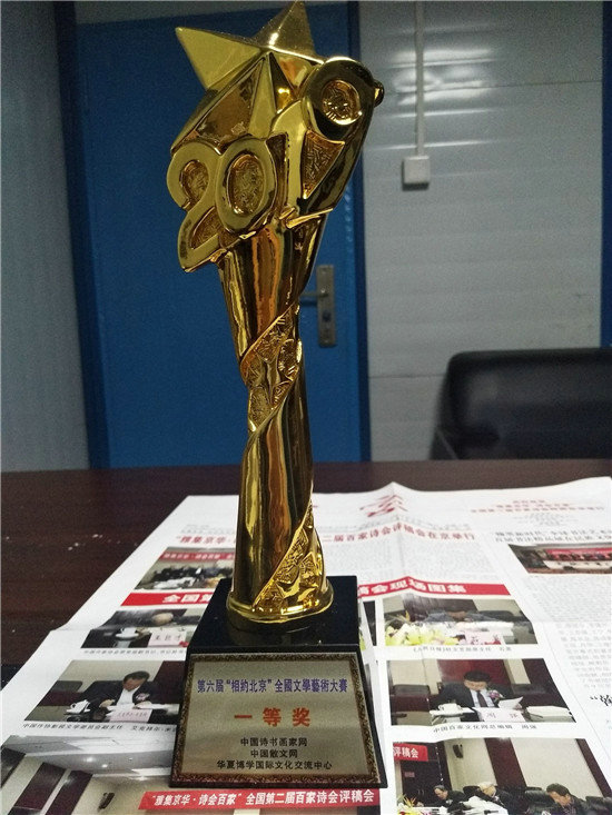 2019年第六屆“相約北京”全國文學(xué)藝術(shù)大賽由中國詩書畫家網(wǎng)、中國散文網(wǎng)、華夏博學(xué)國際文化交流中心主辦,4月26日至29日在北京舉行頒獎(jiǎng)儀式,中國人民解放軍原濟(jì)南軍區(qū)副司令員、濟(jì)南空軍司令員、解放軍中將郭玉祥;全國政協(xié)原副秘書長、全國政協(xié)港澳臺(tái)僑委員會(huì)原副主任、著名書法家張道誠;中國音樂文學(xué)學(xué)會(huì)副主席、原北京軍區(qū)政治部創(chuàng)作室主任、國家一級詞作家石祥;原國家工商總局公平交易局副局長、國家工商總局老干部辦公室主任、中央國家機(jī)關(guān)書法家協(xié)會(huì)副秘書長李文章;中國美術(shù)家協(xié)會(huì)理事、中國華僑畫院院長、國家一級美術(shù)師張清智;中國美術(shù)家協(xié)會(huì)理事、中國國家博物館書畫研究創(chuàng)作中心主任、國家一級美術(shù)師石峰;中國紅十字書畫院執(zhí)行院長、北京藝術(shù)藝術(shù)創(chuàng)作中心常務(wù)副主任王建勛;中國硬筆書法協(xié)會(huì)副秘書長、中國詩書畫家網(wǎng)總編輯、《羲之書畫報(bào)》社副總編輯邵建國等領(lǐng)導(dǎo)專家出席大會(huì)。